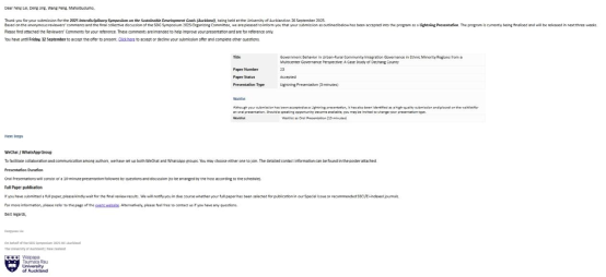 大会上,王棚以《城乡共治视角下的生活垃圾分类困境与路径探索——以中国四川会东县为例》为题,作十分钟口头报告,深入剖析城乡二元结构下垃圾分类政策的现实困境,提出城乡共治的治理路径,回应了联合国可持续发展目标中“可持续城市和社区”“负责任消费和生产”的核心议题;邓景则以《多中心治理视角下四川德昌县政府在城乡社区治理中的行为探究》为题,进行三分钟学术演示,从多中心治理理论出发,结合实地调研,剖析基层政府在城乡治理中的职能与挑战,并提出多元主体协同参与的实践策略,呼应了SDGs“和平与伙伴关系”的研究方向。两位同学以流利的英文表达、扎实的田野调研和鲜明的理论视角,赢得了国际同行的高度关注与赞誉,她们的表现不仅展示了西昌学院在本科生科研培养、国际化教育方面的成果,更体现了新时代青年学子走出课堂、学以致用的实践风貌。会后,王棚同学表示,这次经历极大开阔了她的学术视野,更坚定了将所学知识用于服务地方发展的决心;邓景则感言,学术无国界,希望未来能把更多中国基层治理的经验分享给世界。