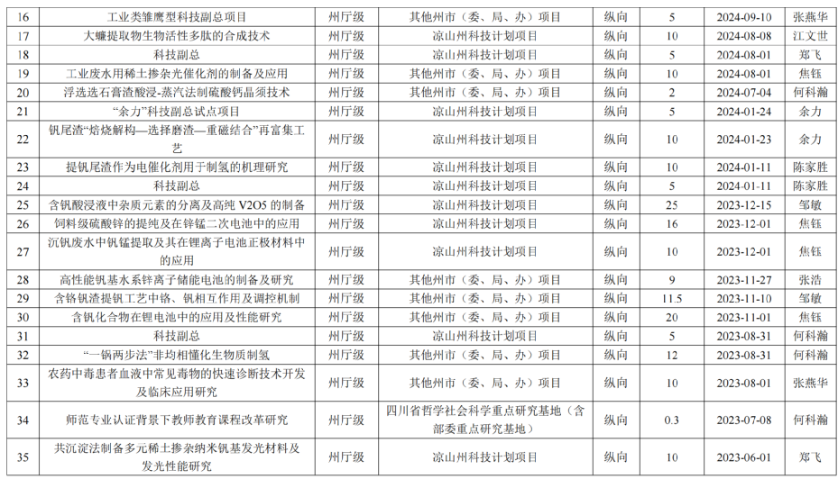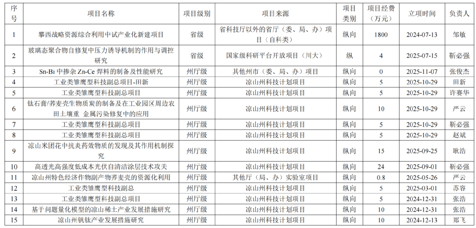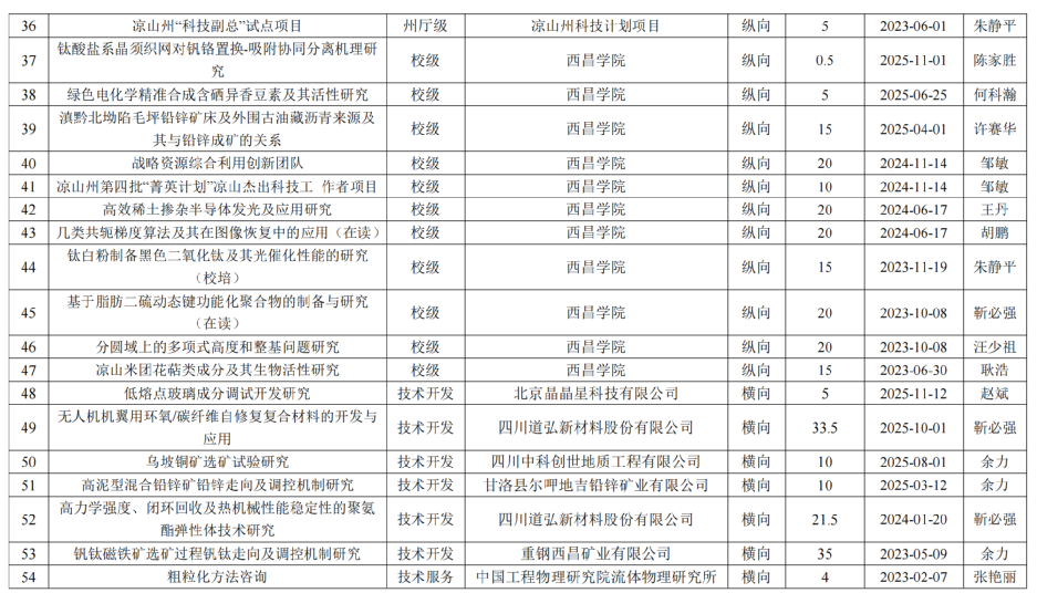 截至2025年12月1日,西昌学院理学院在研科研项目54项目,项目资金总额2379.1万元。其中,校外项目资金2218.6万元,校内项目资金160.5万元。纵向项目资金2218.6万元,横向项目资金160.5万元。省部级项目2项,州和市级项目合计34项。